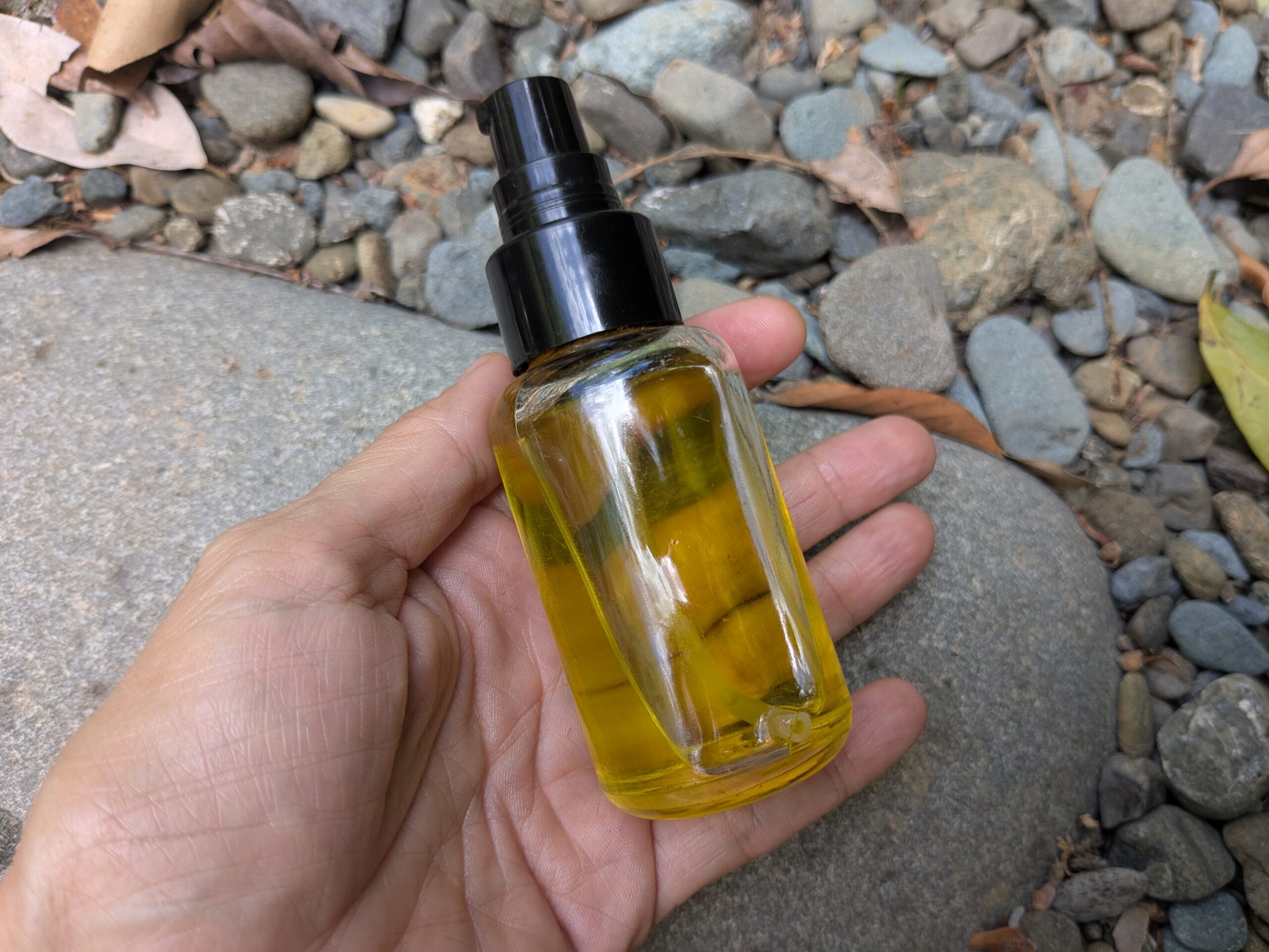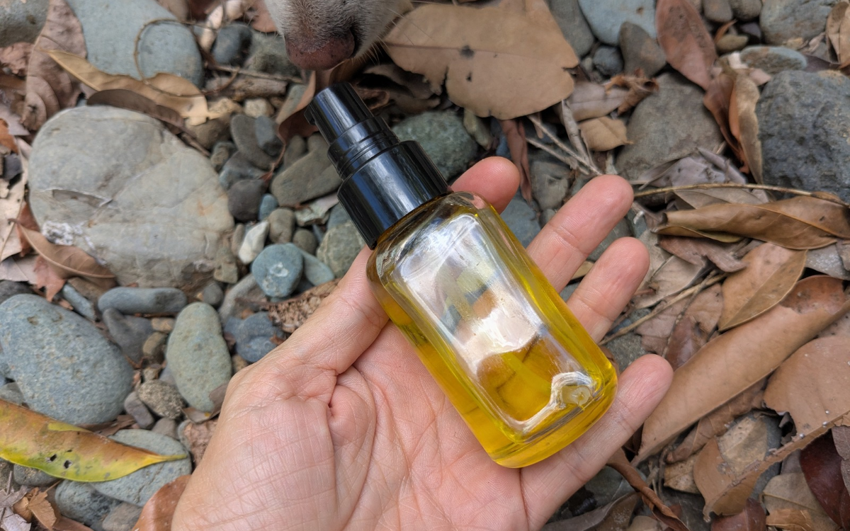 I personally use extra virgin olive oil as the base. My skin loves it, and it is always at hand in the kitchen. I keep the blend in a small glass spray bottle, around 30 to 50 ml, which is the perfect size to carry around and use daily.